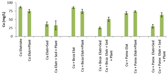 However, in the presence of sediment, Cu levels in solution were either lower or higher in the medium amended with bezafibrate (the difference was only statistically significant in the absence of plants, as shown in Figure 3), indicating that bezafibrate influenced the solubility of Cu and its retention in sediment. However, these small solubility variations, in general, were not reflected in sediment levels or in Cu accumulation by the plant with similar levels being found (Figure 2a,b).