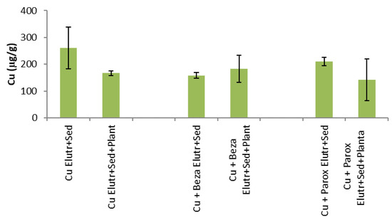 For instance, Sayen et al. [] observed that the antibiotic enrofloxacin slightly reduced the uptake of Cu by P. australis due to the complexation of the metal by the antibiotic, changing Cu bioavailability. However, the formation of the Cu–enfloxacin complex led to an increase in Cu in solution. The authors concluded that the chemical forms of both pollutants changed (different speciation), which can have different impacts on metal uptake by plants in the long term. However, another study has shown that the presence of the antibiotic ceftiofur promoted Cu uptake by P. australis, probably due to the formation of a Cu–ceftiofur complex that potentiated this accumulation []. In the present study, one can suppose also the formation of Cu complexes with bezafibrate and/or paroxetine, although no information on the topic was found in the literature, and research on possible chemical interactions between Cu and bezafibrate or paroxetine is needed.
