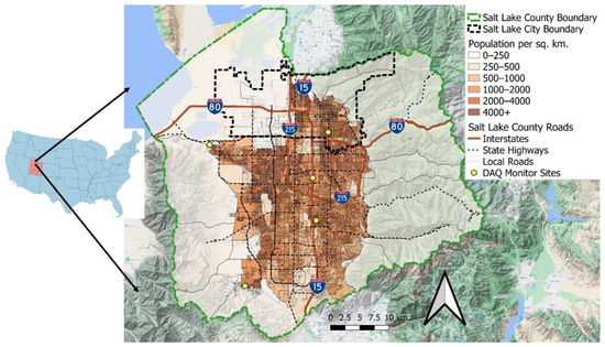 As illustrated in Figure 1, SLC is located at the intersection of two major highways (e.g., I-80 and I-15), and therefore, transportation-related emissions are an important contributor to poor air quality. Like many urban areas, traffic density and congestion in Salt Lake County (SLCo) have been increasing by around 10% or more annually [25], making this and other urban areas increasingly susceptible to transportation-related air pollution. Additionally, SLCo has a unique geography with multiple intersecting high mountain ranges and the Great Salt Lake, surrounding expansive residential housing and a range of heavily polluting industries (Figure 1). The local air pollution problems are further exacerbated by distant and local pollution produced by local and regional dust storms and wildfires in the Western United States. As a result, both the summer and winter months are impacted by elevated ozone [26] and PM2.5 [27].