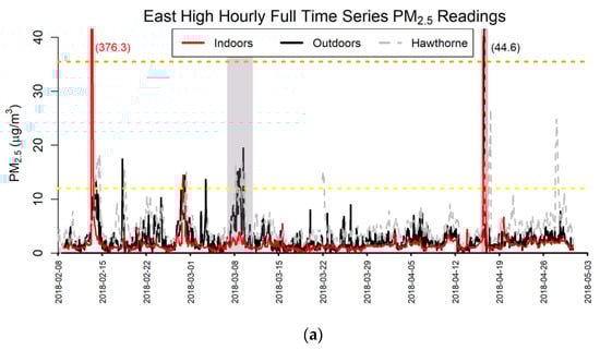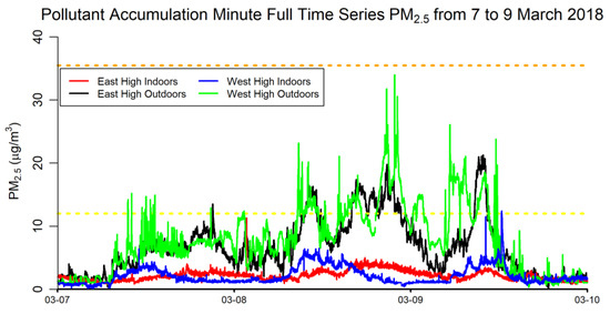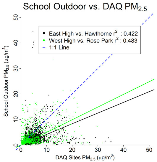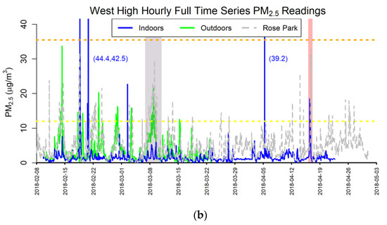 As illustrated in Figure 4a,b, PM2.5 readings are generally higher outside than indoors at both East High and West High. West High, being in a higher traffic area, shows on average approximately 25–50% higher outdoor PM2.5 readings than East High. This demonstrates, for this case study period, the potential environmental inequality impacts. For instance, higher rates of outdoor air quality could lead to lower overall standardized testing scores in low-income schools, even when controlling for other factors (e.g., economic or language status) [6]. It could also lead to higher rates of student absenteeism, which has been shown to impact long-term learning in students [7].