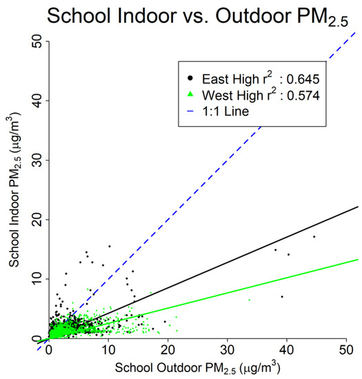 In addition to the averages over the study period, there are three notable anomalies where the PM2.5 concentrations were substantially higher indoors than outdoors. Although we contacted the schools, they were unable to provide explanations for these elevated pollution events. On Tuesday, 13 February, 6:00–9:00 a.m., East High recorded indoor hourly readings of up to 376 μg/m3. These values are too high for too long to be the result of instrument failure, which might be indicated by high values for only a few 1 min observations. As discussed in the Methods section, the instrument was in the gymnasium, and the school buses park and idle outside the door of the gymnasium. As it was a relatively cold day, it is possible that the buses were located close enough to the air intake to directly emit their exhaust, which could then infiltrate the building. It is also possible that vaping activities by students could result in this signal. The prevailing wind during that time was from the southeast; therefore, the outdoor sensor would not have registered the signal as it was upwind from the buses and gymnasium.