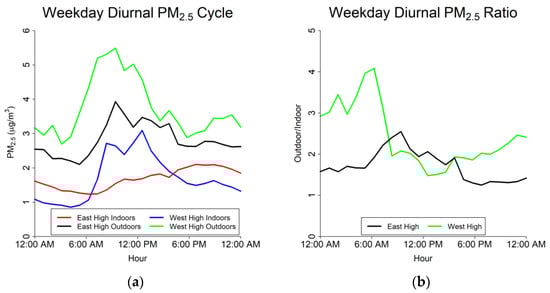 The weekday diurnal cycle PM2.5 concentrations and outdoor/indoor ratio at the four sites are shown in Figure 7. The diurnal cycle is highlighted by the rapid increase in the early morning hours due to the morning rush hour vehicular emissions and combustion activity from commercial and industrial buildings (Figure 7a). Additionally, the atmospheric boundary layer is lowest in the early morning hours. As the day progresses, PM2.5 becomes more well mixed in the atmosphere, leading to a decline in the outdoor concentration. There is a notable lag in the concentration readings for the indoor instruments compared with the outside ones. This is likely due to building infiltration rates and contamination from indoor sources (Figure 7b).
