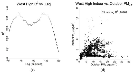 Coefficient of determination and comparison between lagged indoor and outdoor PM2.5 readings at the highest coefficient of determination: (a) coefficient of determination for East High, (b) East High 57 min lagged indoor and outdoor PM2.5, (c) coefficient of determination for West High, and (d) West High 35 min lagged indoor and outdoor PM2.5.