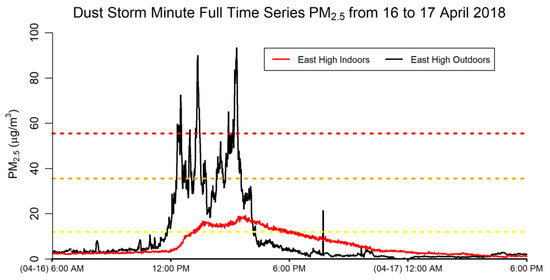 The resulting indoor and outdoor PM2.5 measurements during a dust storm is shown in Figure 10. Only East High had both sensors available during this event as the outdoor sensor at West High was not operational during this event.