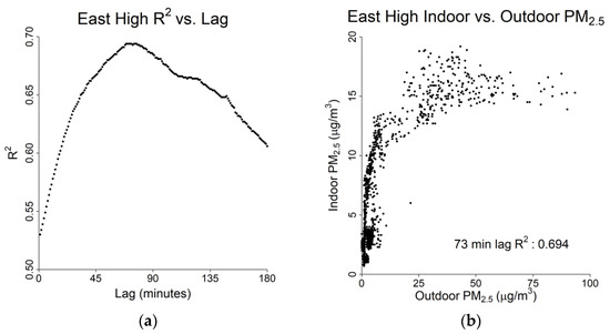 Coefficient of determination and comparison between lagged indoor and outdoor PM2.5 readings at the highest coefficient of determination: (a) coefficient of determination for East High; (b) East High 73 min lagged indoor and outdoor PM2.5.