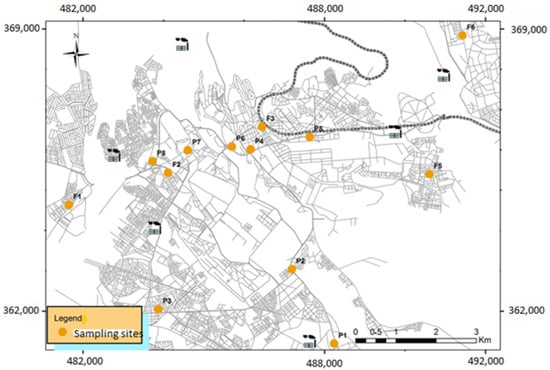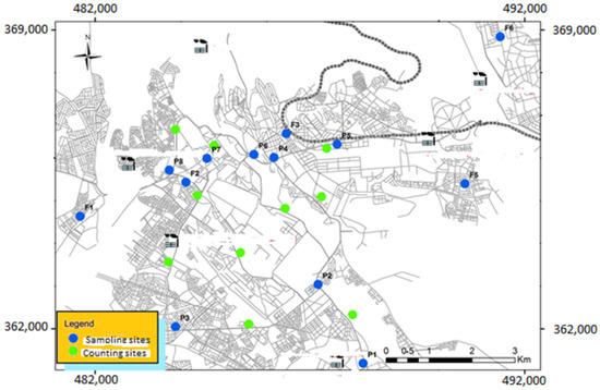 For the monitoring of NO2 levels, passive diffusion tubes of the Palmes type, were deployed at 14 sampling sites, divided into car proximity sites (P) and background sites (F) (Figure 2 and Table 1).