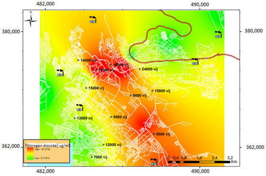 The multidimensional study of urban air pollution in the city of Meknes focused on nitrogen dioxide (NO2) for several reasons: (i) first, NO2 is considered to be a good indicator of urban air pollution, especially since it generates by road traffic and is a precursor of secondary pollutants such as ozone and nitrate particles [39,40]. Second, it is a proxy for some pollutants, such as BTX (Benzene, Toluene, Xylene) [41,42], used in so many epidemiological studies as a marker of the cocktail of pollutants related to combustion [43]. (ii) The link between NO2 exposure and respiratory diseases is increasingly confirmed [43,44], which allows these diseases to be used as health indicators. (iii) It presents a great spatial heterogeneity compared to other pollutants, which allows considering contrasts with the variability of biological and health effects indicators.