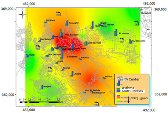 For monitoring spatio-temporal variations of nitrogen dioxide (NO2) content, passive diffusive samplers have been deployed in 14 near-road and residential sites for 14 days. In parallel with the winter campaign to measure the NO2 tracer, road traffic counting sessions were carried out on the city’s main roads. The coupling of the results of the measurement campaigns and the counting sessions under Arcgis 9.3 made it possible to determine the areas most affected by automobile pollution and to carry out a high spatial resolution mapping of the pollutant prospected. The results of this study show that atmospheric NO2 concentrations reach maximum values in the city center and decrease towards its periphery. The analysis of the epidemiological situation of the principal diseases related to air pollution in the city of Meknes during the study period (2010–2014) showed that among subjects aged five years and older, acute respiratory diseases occurred more in women than men. The most affected age group was between 15 and 49 years, while asthma attacks were noted mainly among women aged 50 years and older. Acute respiratory illness and asthma attacks were prevalent in the winter and fall. Among children under five years of age, the age group most affected by pneumonia was those under 11 months. Our integrative approach combined spatialized GIS-based health indicators of these diseases, the location of stationary and mobile sources of air pollution, and measured NO2 levels. This combination has made it possible to detect that residents in areas with heavy road traffic are likely to be more affected than those in areas near industrial activity. The habitat type also contributes significantly to the development and exacerbation of the pathologies studied, especially in the districts of the old Medina.