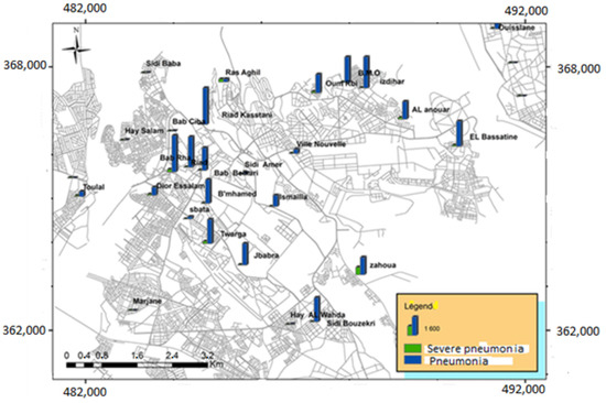 The highest incidences of pneumonia were recorded in Riad, Izdihar, and Bab Rha, while for severe pneumonia, the highest incidences were reported at Zahoua, Ras Aghil, and Riad (Figure 9).