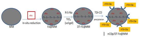 To prepare the β-cyclodextrin-toluenediisocyanide alternating nanopolymer, about 10 g of β-CD was added to 15 v/v acetone in deionized water and stirred vigorously for 1 h. TDI was added in drops and the solution was stirred at 50 °C. It was then poured into a stream of acetone, and the precipitate was separated and washed with acetone and deionized water and dried in a vacuum desiccator for 12 h, labelled as nCDp. Blending of the different components to form the tripartite composite was as follows: about 5.5 g of DT-Fe@MM was dispersed in DMSO and stirred magnetically for 4 h, followed by addition of 1.8 g of nCDp and 2.2 g of SDS at 70 °C with continuous stirring for another 1 h. The mixture was then centrifuged at 3600 rpm for 30 min, and the obtained solid was dried at 110 °C with further calcination at 550 °C for 6 h. The product was labelled nCDp/DT-Fe@MM. The preparation of the tripartite magnetic montmorillonite composite can be represented by the schematic diagram in Figure 1.