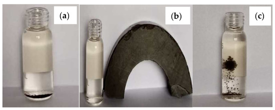 (a) nCDp/DT-Fe@MM without external magnetic field, (b) nCDp/DT-Fe@MM particles attracted to an external magnetic field, (c) nCDp/DT-Fe@MM particles in solution carried by an external magnetic field placed behind it.
