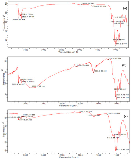 The FT-IR spectra of the raw montmorillonite (MM) and the functionalized composites are shown in Figure 3a–c. The raw montmorillonite showed mostly -OH, Si-O and Al-O peaks at 3623, 998, and 749 cm−1, respectively. The modified montmorillonite not only has the characteristic peak of MM but also shows new peaks, which proves that the chemical structure of the modified composites has changed. The sulphur doped titanium composite showed peaks for -NCS (isocyanate) at 1990 cm−1 and the organic modified composite showed peaks for open chain azo (-N=N-), cyanide (-OCN), and transition metal carbonyl (-M=CO-) at 1032, 1625 and 2050 cm−1, respectively. This new peak showed functionalization of the composites occurred and that sulphur, titanium and the isocyanate-cyclodextrin biodegradable polymer were intercalated into the montmorillonite framework [3,5,51,52].