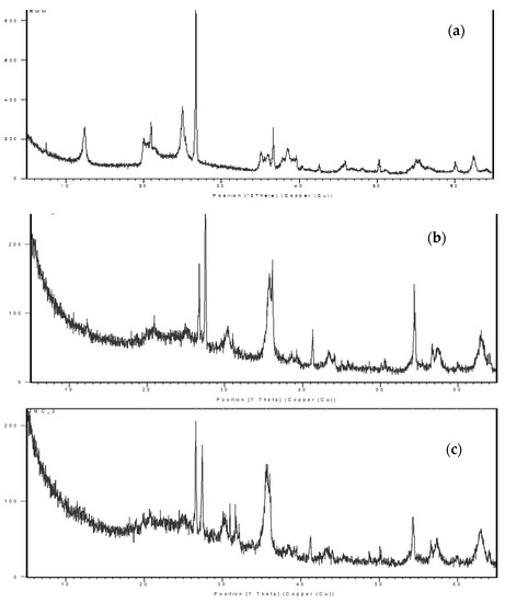 The bulk structure of both parent clay and the modified clay composites were confirmed by X-ray Diffraction (XRD). X-ray diffraction data of the obtained materials were obtained by a Bruker D8 Advance powder X-ray diffractometer (Bruker, Munich, Germany) of Cu Ka radiation with a step size of 0.028 at a rate of 17.7 s step−1 from 2° to 60° according to the method of Liu et al. [49].