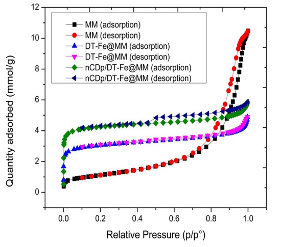 Nitrogen adsorption–desorption measurements (BET method) was measured using exactly 1 g each of MM, DT-Fe@MM and nCDp/DT-Fe@MM samples at liquid nitrogen temperature (−196 °C) and relative pressure Po/P between 0.01–1.00 with an autosorb BET apparatus, Micromeritics ASAP 2020, surface area and porosity analyzer. The analysis procedure is automated and operates with static volumetric technique. Before each measurement, the samples were first degassed by heating at 200 °C for 2 h according to the method of Liu et al. [49].