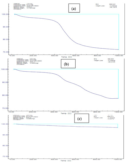The thermogravimetric analysis plot for the unmodified montmorillonite, doped titanium nanocomposite and the tripartite magnetic montmorillonite is presented in Figure 7a–c. The unmodified clay showed two stages of weight loss at a temperature between 30–150 °C and 450–600 °C, corresponding to a release of physisorped water and removal of the dehydroxylation layer inside the clay material, respectively [49]. The doped titanium nanocomposite exhibited mass loss at 30–150 °C, 450–550 °C and above 800 °C, which were attributed to a slight removal of absorbed water, removal of the layer of dehydroxylation, and the burning of carbon residue, respectively [49,50]. For the tripartite nanocomposite, there was only negligible mass loss until a temperature of 230–400 °C was reached, which was attributed to the removal of N-groups from modifier groups [56]. Also, from the plots, the modified nanocomposites presented lower percentage mass losses (22.4 and 3.4) compared to the unmodified clay (28.1).