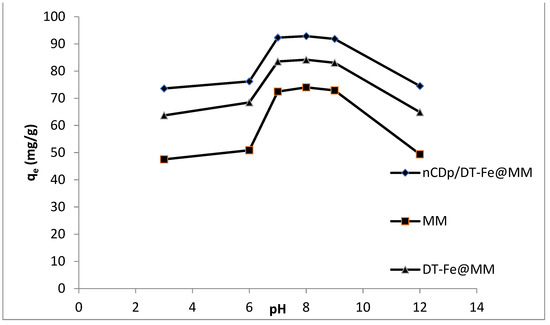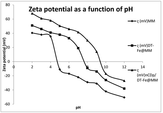 Zeta potential of the adsorbents materials was also studied as a function of pH to ascertain the stability of the materials to coagulation in aqueous dispersion. The result of the zeta potential studies is presented in Figure 8. From the results, the zeta potentials of the materials were high, showing high stability to coagulation. Also, the isoelectric point of the materials (pzc) was defined for each adsorbent, showing that the materials were generally stable to agglomeration since their zeta potential falls outside the isoelectric point. The pzc for the adsorbents were MM (4.7), DT-Fe@MM (7.4) and nCDp/DT-Fe@MM (9.4), respectively.