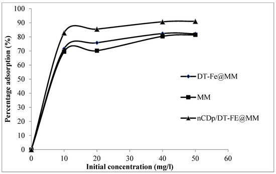 From the plots, it was also found that percentage adsorption increases with an increase in initial concentration of adsorbate for the composite in contrast with other adsorbent with relative decrease adsorption at higher concentration. This suggests that the composite has a higher surface area. This functionalized surface enhances better pollutant-adsorbent interactions to adsorb at higher concentration compared to other adsorbents, which are suspected to undergo slight desorption at a higher concentration due to low surface area and poor pollutant-adsorbent interactions [57,58,59].