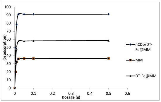 Result of effect of dosage on adsorption of BPA unto nCDp/DT-Fe@MM, DT-Fe@MM and MM is presented in Figure 10. Adsorption increased with dosage and reaches equilibrium at a dosage of 0.02 g/L. Further increase in adsorbent dosage was found to exert little or no effect on adsorption capacity of the process. Higher adsorption efficiency was recorded for the tripartite magnetic composite. This was due to better functional sites and interaction forces as a result of the modifications.