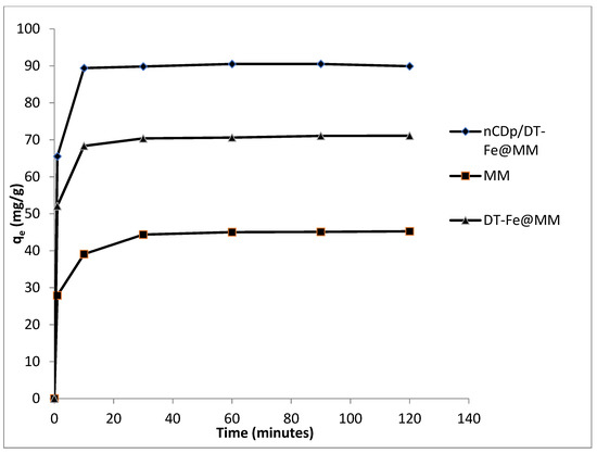 The variation in rate of BPA adsorption unto the three adsorbents was studied and the result is presented in Figure 11. The adsorption of BPA increased with increasing time and reaches equilibrium at 30 min with a slight change up to 90 min followed by slight decrease beyond this equilibrium time. Adsorption capacity of nCDp/DT-Fe@MM for BPA was higher than that of DT-Fe@MM and MM. Increased adsorption by the tripartite magnetic montmorillonite was due to addition of hydrophobic cyclodextrin nanopolymer with positive N-group, which increases the π-π and OH-π interactions as well as increased electrostatic interaction between BPA and the functionalized composite [5,33,59,60].