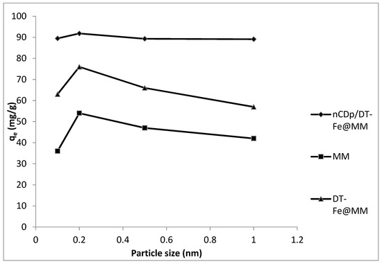 The effect of adsorbent particle size on the adsorption of BPA from an industrial effluent is presented in Figure 13. Adsorption increases with particle size, with maximum adsorption occurring at 0.02 nm and thereafter began to decrease with increase in particle size. It was found that lower adsorption capacity at 0.1 nm could be due to agglomeration followed by rapid desorption [62]. Larger particle size ranging from 0.2 nm to 1 nm can resist the agglomeration effect; hence, a higher adsorption capacity is maintained.