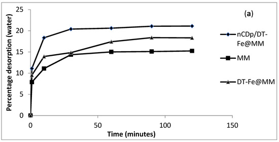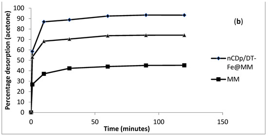 The rate of desorption of adsorbate molecules from used adsorbent was studied and the result is presented in Figure 15a,b. The rate of desorption was higher for the tripartite magnetic composite than the conventional doped titanium composite and much lower for natural montmorillonite. Rate of desorption was comparably higher in acetone as eluent compared to the DI water. Also, high rate of desorption in the tripartite magnetic composite in both eluents suggests increased pore volume and high surface area and possible application as reusable adsorbent in waste water treatment plants [63]. Acetone was a better solvent for BPA and can be used for regeneration of used adsorbent and enhance reuse. [13,53].