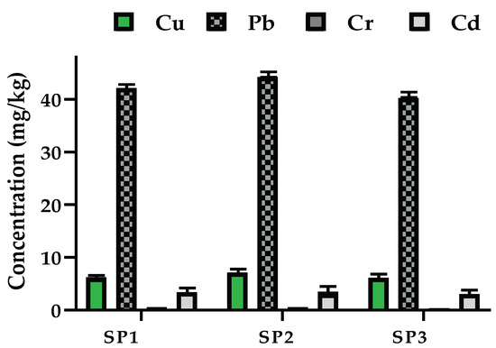 The mean concentrations of the analyzed HMs are depicted in Figure 3. The concentrations of the HMs were 6.177 ± 0.003 mg/kg, 7.111 ± 0.002 mg/kg and 6.111 ± 0.01 mg/kg for Cu; 42.118 ± 0.008 mg/kg, 44.212 ± 0.002 mg/kg, and 40.222 ± 0.003 mg/kg for Pb; 0.494 ± 0.003 mg/kg, 0.522 ± 0.010 mg/kg and 0.352 ± 0.007 mg/kg for Cr; 3.393 ± 0.005 mg/kg, 3.453 ± 0.003 mg/kg, and 3.002 ± 0.002 mg/kg for Cd. Thus, the concentration of the HMs in the samples followed the sequence Pb > Cu > Cd > Cr. In addition, there were significant (p <0.05) fluctuations in the concentration of the HMs between the sampled sites (SP1 to SP3), as per the one-way ANOVA results.