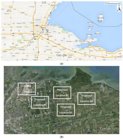 Water bodies and watersheds were selected for evaluation in order to estimate mercury concentrations in surface water and sediment. These water bodies and watersheds were drawn in IRAP-h View by drawing receptor polygons around the corresponding water bodies. The geographic information system (GIS) shape files were imported into IRAP-h View as the base map in order to define water bodies, watersheds and receptors. In this study, one water body—Lake Erie—and nine watersheds—Maumee River, Portage River, Raisin River, Toussaint River, Ottawa River, Halfway Creek, Plume Creek, Otter Creek and Swan Creek—are considered. The exposure to mercury emissions from the proposed industrial plants that are deposited on surface water bodies used for drinking purposes is considered by the drinking water ingestion pathway. The contributions from deposition onto surface water are considered by the HHRAP equations used to estimate COPC concentrations in the surface water. Lake Erie was used as a water body receptor in order to model the drinking water ingestion pathway. The Lake Erie water body and watershed polygons are shown in Figure 3a, while Figure 3b shows the graphic representation of the four proposed plants. The deposition into the fishable water bodies located near the proposed industrial plant is considered in order to model the fish ingestion pathway. Both cancer risks and non-cancer hazards from the fish ingestion pathway, calculated by considering deposition onto Lake Erie, were added.