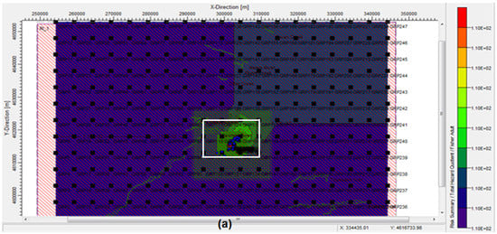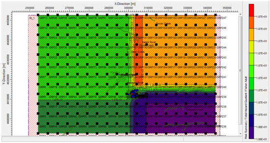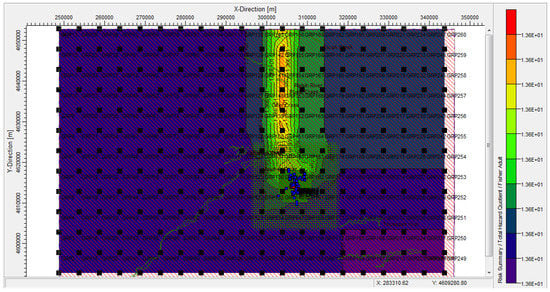 It can be seen from the IRAP results that the total non-cancer hazards vary over the area of concern. The lowest identified hazard quotient is in the whole area of concern except the north-eastern area of the proposed location, with the predicted value of 109.91. In contrast, the highest identified hazard quotient for all exposure scenarios is in the north-eastern area (Lake Erie area) of the proposed location, with the predicted value of 110 at receptor 136 for the hazard quotient. For location 3, from Table 7, it can be seen that the highest identified hazard index is also for the fisher adult and fisher child exposure pathways, with predicted values of 13.6 and 9.58, respectively. It can be seen that the total non-cancer hazards are higher than the target hazard index of 1. From Figure 6, the lowest identified hazard quotient is in the whole area of concern except the northern area of the proposed location, with the predicted value of 9.58. In contrast, the highest identified hazard quotient for all exposure scenarios is in the north-western area (Lake Erie area) of the proposed location, with the predicted value of 13.6 at receptors 149, 150, 151, 152, 153, 154, 155 and 155 for the hazard quotient.