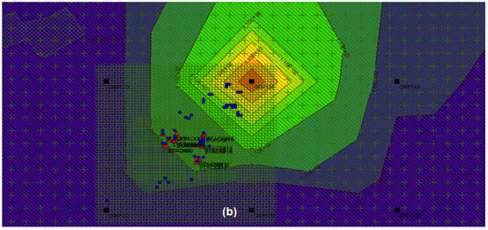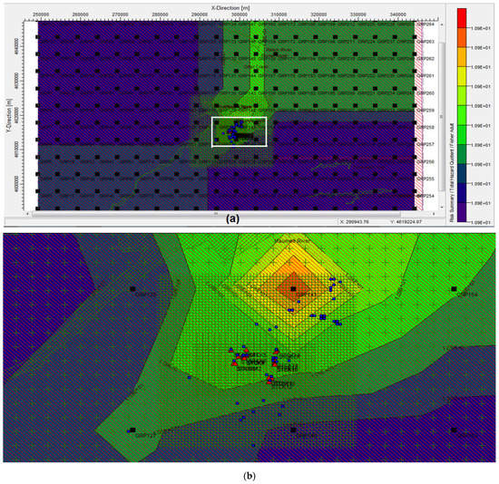 (a) Contour plot of the total hazard quotient for location 4. (b) Magnification of the area enclosed by white rectangle in (a).