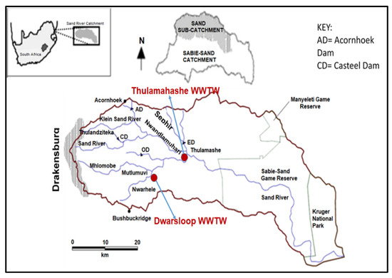 Sand River Catchment and Location of the Dwarsloop and Thulamashe WWTWs.