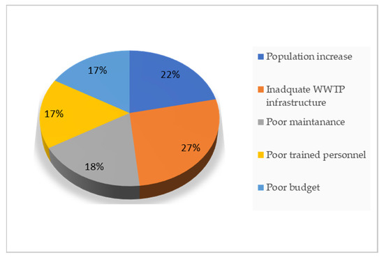 The present study findings revealed that population growth, inadequate/dilapidating infrastructure, poor budgeting, and a lack of trained personnel to operate the WWTWs are the contributors to poor effluent discharged from WWTWs. Inadequate/dilapidated infrastructure was reported as the most prevalent factor, which could be attributed to poor maintenance and population growth. Generally, most municipal wastewater treatment works are in poor condition due to a lack of maintenance. Population growth can be linked to the inability of WWTW to handle waste because, as the population grows, so does domestic waste [25]. Population increase and industrialization have generated an enormous amount of untreated wastewater being discharged into water bodies as raw water. It was also found that population growth is the case in the Sabie-Sand River Catchment. Other factors, such as a lack of trained personnel and poor budget utilization, could also be attributed to inadequate/dilapidated infrastructure [26].