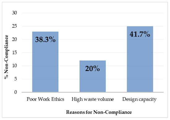 The survey findings in the study revealed that the majority (n = 54; 90%) of participants responded “Yes” to the question that the sewage systems in Bushbuckridge do not adhere to the South African water quality discharge standards, while 10% (n = 6) of participants responded “No.” Figure 3 below depicts the reasons given by respondents for the discharge of effluent that do not meet the required water quality standards by sewage systems. Most of the respondents in the study suggested that the WWTW’s design capacity (41.7%) and poor work ethics (38.3%) are the major factors causing poor compliance, while a small percentage (20%) stated that the municipality receives a high amount of waste.
