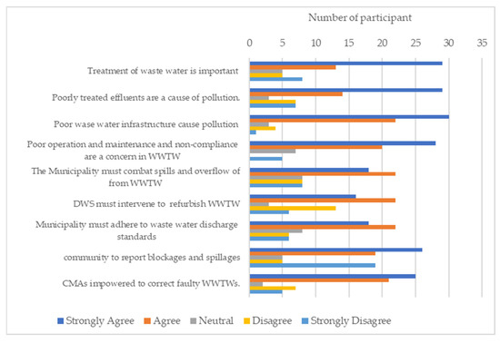 In order to determine the factors from the WWTW that may contribute to the pollution of the Sand River Catchment, a survey was conducted using the questions shown in Figure 4. The responses on the Likert scale clearly indicate that respondents strongly agree to a greater degree on all the statements. According to the study, out of 60 participants, 29 strongly agreed that wastewater treatment is very important and also strongly agreed that poorly treated effluents are the source of pollution in the catchment. Thirty-four (34) participants strongly agreed that poor wastewater treatment infrastructure contributes to pollution. Although 28 strongly agreed that inadequate operation, management, and non-compliance of WWTWs are issues to be concerned about. Only 22 participants agreed that the municipality would deal with the WWTW’s overflows and spillages, as well as meet wastewater treatment discharge requirements. They also agreed that the Department of Water and Sanitation (DWS) should support refurbishing these WWTWs. In terms of the community reporting blockages and spillages, 26 participants strongly agreed, while 41 participants strongly agreed that CMAs should have the authority to correct faulty WWTWs. The study indicates that there is poor adherence to discharge Water Quality Standards, which were reported to be a result of poor work ethics from poorly trained personnel.
