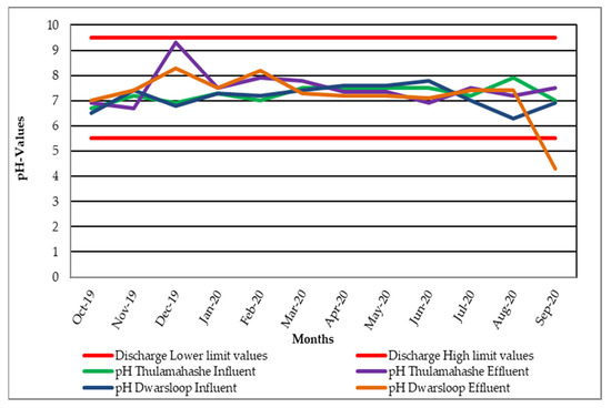 Figure 5 depicts the mean pH-values in Thulamahashe WWTW influent and effluent ranging from 6.70 to 7.00 and 6.90 to 9.30, respectively, while Dwarsloop WWTW ranged from 6.50 to 7.80 and 4.30 to 8.30. At Dwarsloop WWTW, the mean pH-value decreased from the influent (6.90) to the effluent (4.30) during September 2020. According to the general effluent standard pH of treated wastewater effluent should range between 5.5 and 9.5. The pH levels at the Dwarsloop WWTWs were low in September, which could have had an impact on the receiving water bodies.