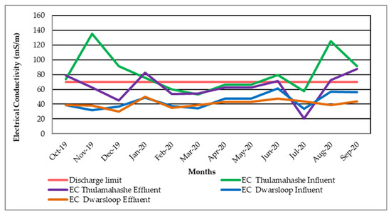 Figure 6 shows the average electrical conductivity concentrations in the Thulamahashe WWTW’s influent and effluent ranging from 52.80 to 135.20 mS/m and 20.80 to 87.50 mS/m, respectively, while the Dwarsloop WWTW ranged from 31.90 to 61.10 mS/m and 29.70 to 44.00 mS/m. In both treatment plants, there was a decrease in the electrical conductivity concentration from the influent to the affluent. This implies that the two WWTWs could remove some ions from the wastewater prior to discharge. The electrical conductivity concentration in the Thulamahashe and Dwarsloop WWTW's effluents was within the general effluent standard limit of 70 to 150 mS/m throughout the study period. Conductivity measurements could be used to monitor processes such as biological nitrogen removal in wastewater treatment, which might cause a change in conductivity [10]. Electrical conductivity is a good indicator of the total salinity. Therefore, if the wastewater effluent is used for irrigation and the electrical conductivity is above the permissible limit, it can cause serious harm to crop and turf grass growth [19].