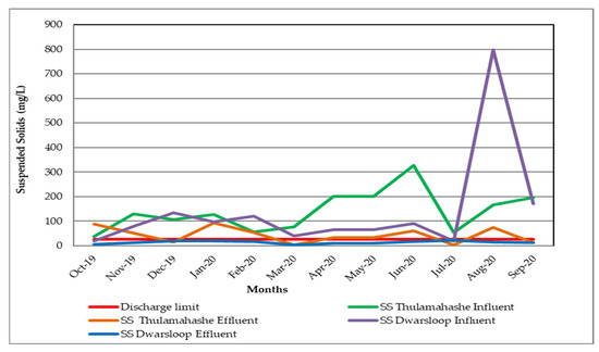 Figure 7 depicts the average concentrations of suspended solids in the influent and effluent of Thulamahashe WWTW, which ranged from 37.60 to 326.00 mg/L and 2.00 to 93.60 mg/L, respectively, while at the Dwarsloop WWTW, the concentrations ranged from 18.00 to 797.00 mg/L and 2.00 to 21.50 mg/L. The Thulamahashe WWTW had higher average SS concentrations in the effluent than the specified general effluent standard limit of 25 mg/L throughout the study period, except for December 2019, March 2020, July 2020, and September 2020. While in the Dwarsloop WWTW, the effluent concentrations were within the specified limit. The higher concentration of total suspended solids (TSS) in trickling filter WWTW effluents may be due to uncontrolled biomass slough-off [20].