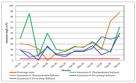At the upstream and downstream points of the Sand River Catchment, respectively, ammonia concentrations varied from 0.01 to 0.23 and 0.01 to 1.43 mg/L as N, but at the Thulamahashe WWTW’s discharge point, it ranged from 0.02 to 32.9 mg/L as N. Ammonia concentrations varied from 5.8 to 39.0 mg/L as N at the Dwarsloop WWTW’s discharge site, and from 0.01 to 13.10 and 0.01 to 0.03 mg/L as N at downstream and upstream points of the Mutlumivi River Sub Catchment, respectively. The discharge points for both WWTW during the study were not within the specified discharge limits of 3 mg/L. The ammonia concentrations in both catchments and some sapling points in different months of sampling were above the TWQS for domestic use (0 to 1.0 mg/L as N), aquaculture (0 to 0.025 mg/L as N in cold water) and aquatic ecosystem (0 to 0.007 mg/L as N). Ammonia as a gas is reported to be toxic to fish and other aquatic species. The ammonia concentrations in the current study surpassed the chronic and acute effect values, which lead to respiratory systems of numerous animals and can induce acute poisoning in fish, as well as systemic loss of balance, hyperexcitability, increased breathing rate, cardiac output, and oxygen consumption [24]. Furthermore, it can cause convulsions, coma, and even death in severe circumstances. This high ammonium level has proved to be a prevalent sewage pollutant that contributes to eutrophication.