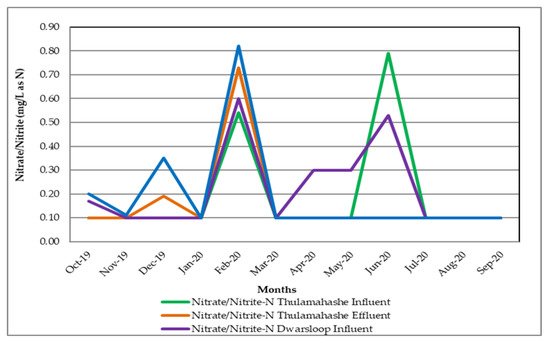 Figure 9 depicts the average nitrate/nitrite concentrations in the influent and effluent of the Thulamahashe WWTW, which ranged from 0.10 to 0.79 mg/L as N and 0.10 to 0.73 mg/L as N, respectively, whereas the Dwarsloop WWTW ranged from 0.10 to 0.60 mg/L as N and 0.10 to 0.35 mg/L as N. Throughout the study period, nitrate/nitrite concentrations were within the general effluent standard limit of 15 mg/L as N in both WWTWs, according to the findings. The current study established that nitrate/nitrite concentrations in both WWTW are extremely low and thus have no impact on the receiving water bodies. However, under normal conditions, where nitrate concentrations are within permissible limits, nitrates are beneficial to plant nutrition and are responsible for a healthy aquatic environment.