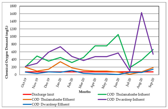 Figure 11 depicts the average COD concentrations in the Thulamahashe WWTW influent and effluent, which range from 188.00 to 1057.00 mg/L and 16.00 to 76.00 mg/L, respectively, while concentrations in the Dwarsloop WWTW ranged from 106.00 to 1632.00 mg/L and 25.00 to 149.00 mg/L. Both wastewater treatment plants demonstrated their effectiveness in removing chemical oxygen-demanding compounds from influents, even though they did not meet the required limit. The recommended limit of COD should be 75 mg/L. COD concentrations in the Thulamahashe WWTW were above the limit throughout the study period, except for the June and July 2020 effluent, which had low concentrations of 74 and 16 mg/L, respectively. Concentrations in the Dwarsloop WWTW were low, except in February and September 2020, when they were significantly higher than the recommended limit, at 113 and 149 mg/L, respectively. Higher COD levels indicate that there is more oxidizable organic material in the water bodies, which reduces dissolved oxygen (DO) levels. A reduction in DO can lead to anaerobic conditions, which are harmful to higher aquatic life forms, and the COD is an important water quality parameter because it provides an index to assess the impact of discharged wastewater on the receiving environment [21].