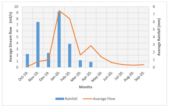 The monthly rainfall data collected at the Sand River Catchment during the study period ranges from 0 to 12.81 mm, with the average monthly rainfall for 2019 being 4.00 mm and 2.00 mm for 2020. Between October 2019 and April 2020, a variance in rainfall was observed in the area, presenting the rainfall season. From the graph, it was observed that in October 2019, at the beginning of the new rainfall season, there was an increase in precipitation. Figure 12 depicts the Sand River Catchment’s monthly average streamflow, which ranged from 0.095 to 7.488 m3/s. Peak flow was significantly higher in January and February 2020, with average flows of 7.488 and 6.414 m3/s, respectively. The similar study observed the same pattern. The observation is that during the rainy season, runoff occurs in dissolved forms eroded during flow events, accounting for a significant proportion of transport from most cultivated lands [22]. It is highly likely that the higher concentrations observed during periods of higher rainfall are due to this mode of nutrient transportation.