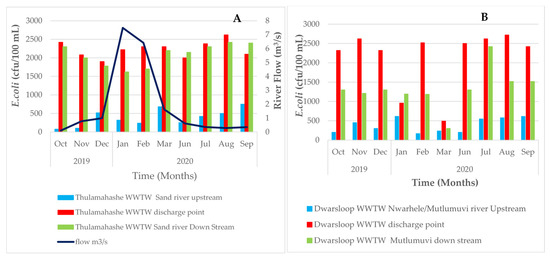 E. coli count in water resources (A) Sand River Catchment and (B) Mutlumivi River Sub Catchment.