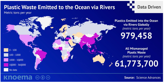 - Knoema. The Main Sources of Plastic Waste in the Ocean—Knoema.com. [Online] Knoema. 2021. Available online: https://knoema.com/infographics/qjigabe/the-main-sources-of-plastic-waste-in-the-ocean (accessed on 7 November 2022).