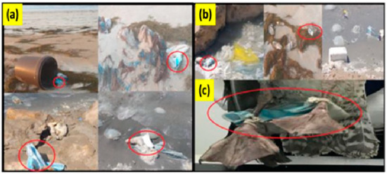 Adverse effects of COVID-19 PPE plastic pollution on marine and coastal ecosystems. (a) Face masks dotting a beach, (b) various plastic types found at a beach. (c) Seabirds’ feet tangled in face mask cords [57].