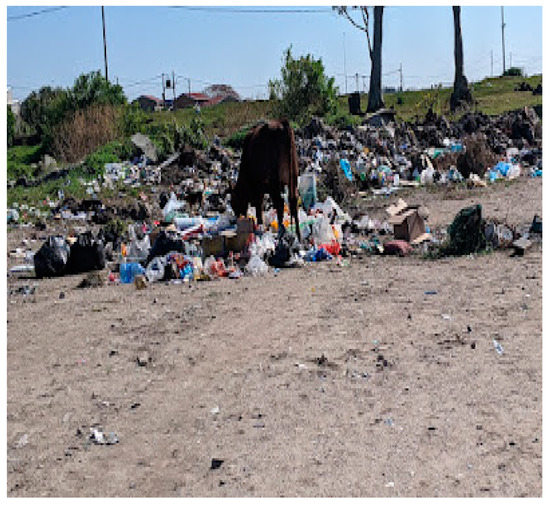 Jiang [114] summarized the presence of plastic wastes in food and animals and articulated the pervasive biological exposure to micro- or nanoplastics, implying that acknowledging the health consequences is a pressing and unmet need. During this review, we saw a cow rummaging waste in one of the South African cities and churning away at plastic waste (See Figure 6).