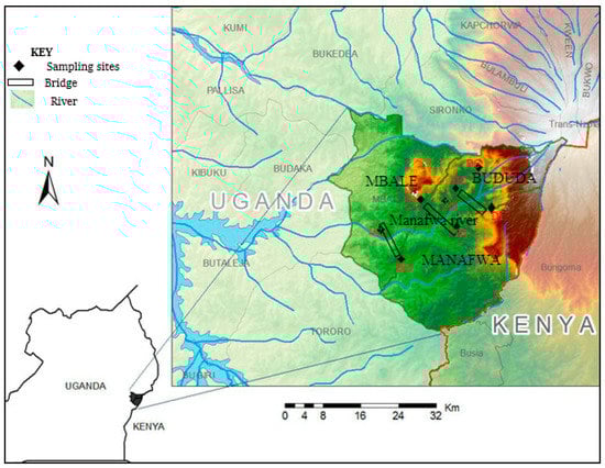 The dusts were sampled from selected urban roads, highways and pedestrian bridges constructed over Manafwa River (0.9420° N 33.920° E), the longest river that flows through Mbale and Butaleja districts of Eastern Uganda (Figure 1). The river is fed by various tributaries (such as Sala, Liisi, Wukha, Tsutsu, Pasa, Kufu, Nambale and Makhuba) and small streams from the transboundary Mt. Elgon [42]. Manafwa River is about 14.63 km long, and its water quality has been degraded due to economic activities such as sand mining and frequent floods.