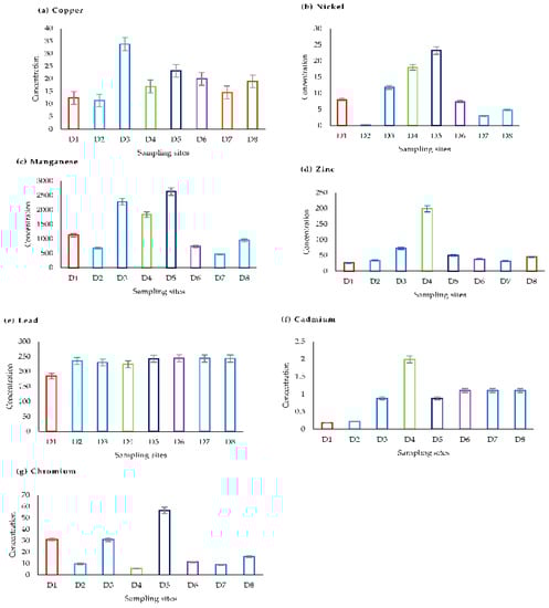 The and PERI, on the other hand, proved that there is low to considerable ecological risks imposed by dust in the studied sites, specifically with respect to Cd and Pb (Table 6). The risk in order of severity followed the concatenation: Cr < Zn < Ni <Cu < Mn < Pb < Cd. The high levels of Cd and Pb in environmental compartments can be attributed to the use of leaded petrol and lead-based paints as well as disposal of dead nickel–cadmium batteries and lead–acid accumulators [65,66]. Altogether, these results attest to the fact that the ecological biodiversity of the studied sites is at low to moderate risk.