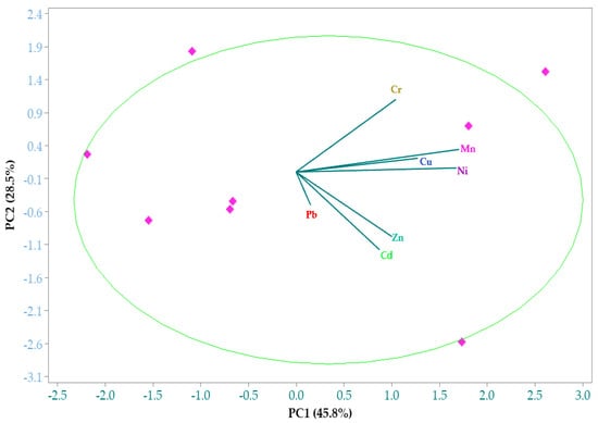 Owing to the correlation complexity, PCA was performed and superseded by extraction of the eigenvalues and eigenvectors from the correlation matrix, so as to establish the number of significant principal components and the percentage of the total variance that they explained. Evidently, Cu and Mn; Cu and Ni; Mn and Cr; and Cd and Zn exhibited notable correlations in the first principal component. Based on eigenvalues greater than 1 at p < 0.05 [17,20], the results (Table 4) show that they could account for 91.4% of the total variance. The eigenvalue (1.200) of PC3 explained about 17.1% of the total variance, and was mainly loaded with Cu, Pb, Cd and Cr. These could plausibly be attributed to vehicular traffic [17]. The second component (PC2) is loaded with Cu, Ni, Mn and Cr, accounting for 28.5% of the overall percentage variance. This could be apportioned to geogenic activities in soils from those sites with moderate to heavy vehicular traffic flows. Cu, for example, is a major element of vehicle parts (tires and brakes), which on wearing can lead to its inevitable emission in dusts [20]. For highways, previous studies have also offered compelling evidence that increase in Mn concentrations in dusts from them is related to the high road traffic flow [61,63]. The first principal component (PC1) was loaded with all the PTEs, but correlated very strongly with Ni and Mn, which individually contributed high loading values (0.533 and 0.525, respectively) and explained 45.8% of the total variance. The source of this factor may be contributions mainly from traffic, especially heavy trucks and cars passing through the one-stop border points. Figure 3 is the variable factor map depicting the quadrant in which the individual PTEs belonged in the PCA.