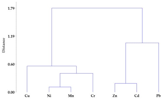 Cluster analysis was further performed to establish any existing similarities among the PTEs in the dust samples. The dendrogram of different PTEs and the sampling stations obtained by Ward’s method is illustrated in Figure 4. The results showed that PTEs in the samples were grouped into two major clusters. Cluster 1 was formed with Cu, Ni, Mn and Cr, while cluster 2 was composed of Pb, Cd and Zn. The results indicated that the elements in a given cluster were possibly derived from analogous anthropogenic sources [52].