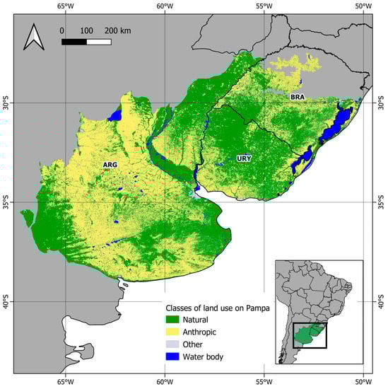 - Projeto MapBiomas Pampa Trinacional—Coleção 2.0 da Série Anual de Mapas de Uso e Cobertura do Solo. 2023. Available online: https://pampa.mapbiomas.org/pt-BR (accessed on 11 April 2023).