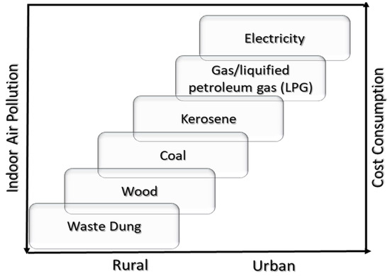 Around three billion of the world’s population in developing countries depend on biomass to meet their household energy needs [78,79,80]. Relative to the developed countries, the indoor air pollution levels have been found to be quite high in developing countries [81]. Using biomass fuel, wood, coal, crop residues, animal dung, etc., produced high amounts of COx, CO, and VOC in the indoor air [82]. Due to indoor pollution, the increasing risks of chronic respiratory and cardiac diseases were observed in the developing countries [83]. Pakistan is a predominantly rural country having an average family size of five to seven members [84]. As per an estimate, about 90% of the rural and 50% of the urban population rely on biomass fuels in Pakistan [85,86,87]. However, this consumption was decreased for the population with improved income and economic conditions [88]. Hence, the biomass households were mostly found among the low-income population in developing countries (Figure 3). In urban areas, clean and efficient indoor energy sources such as liquified petroleum gas and electricity were used.